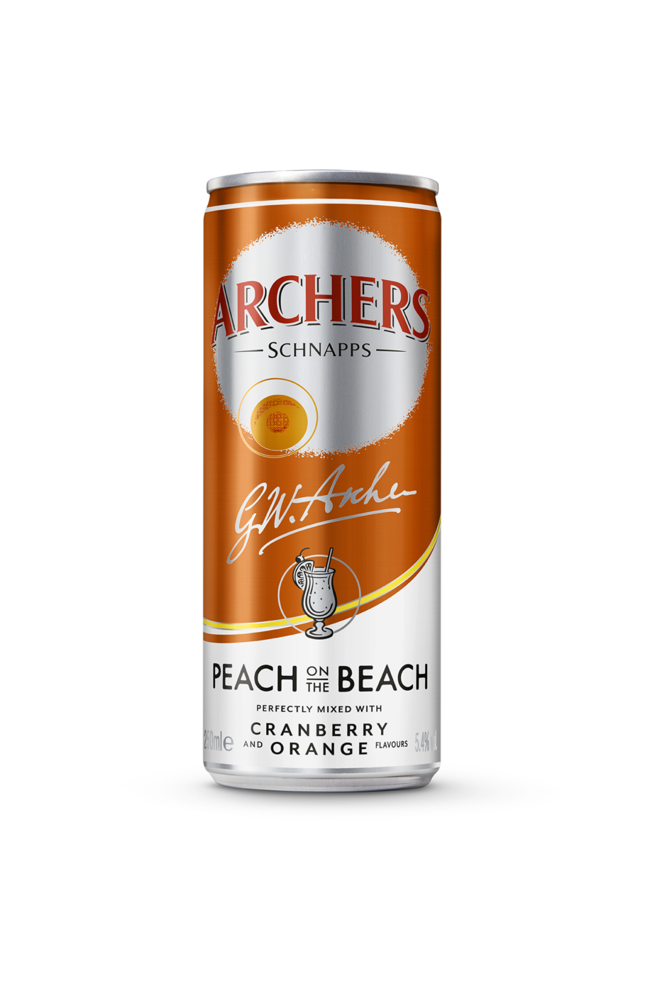 Archers Peach on the Beach in a can – a sun-soaked blend of peach, , orange, and cranberry flavours. Fruity, refreshing, and always ready to go.Cocktails